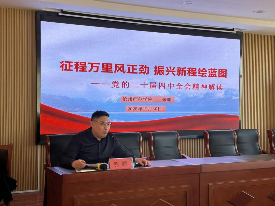 为推动党的二十届四中全会精神在基层落地生根,切实把基层干部的思想和行动统一到党中央决策部署上来,12月30日,我校学生处科长张鹏受邀走进帮扶村河间市沙河桥镇罗位村,为全镇中层干部、村支部书记及乡镇班子成员开展专题宣讲。