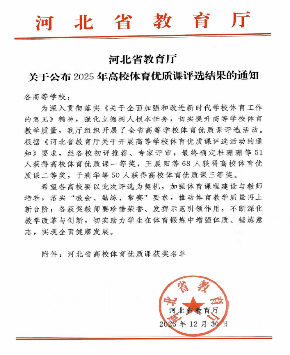 近日,河北省教育厅公布2025年河北省高校体育优质课评选结果,我校体育学院王梓乔、郝宗帅两位教师凭借扎实的专业素养与创新的教学设计,在本次评选中脱颖而出,分获一等奖、三等奖。这一佳绩不仅是对两位教师个人教学能力的高度认可,更充分彰显了我校在体育课程建设、教学创新实践等方面的成果,体现了我校教师队伍优良的专业素养与过硬的教学水平。
