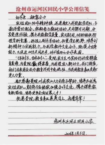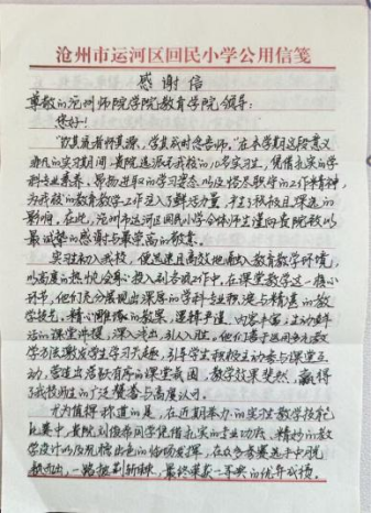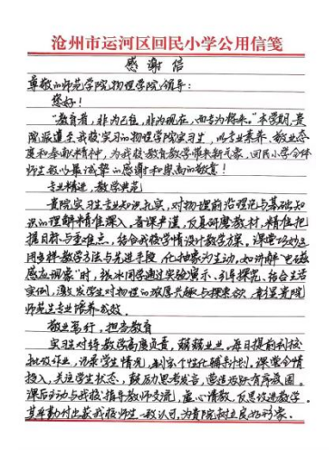 马淑静亲笔书写的感谢信表达了她对教育学院、物理与信息工程学院等10余名实习生专业素养与综合表现的高度认可以及对我校实践育人工作的充分肯定。同时,她也表达了深化院校合作的热切愿望。