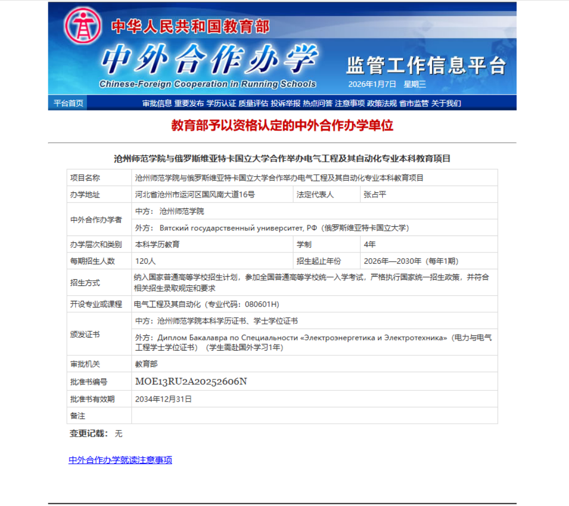 本次获批的中外合作办学项目采用“3+1”联合培养模式,中英文双语授课。学生前三年在我校就读,俄方选派优秀教师赴线下授课;第四年符合条件者赴俄罗斯维亚特卡国立大学学习,考核合格后可同时获得沧州师范学院本科学历证书、学士学位证书及俄方电力与电气工程学士学位证书。