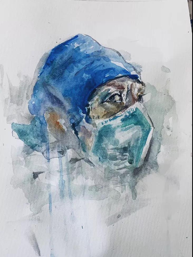 在网上看到了许多医护人员奋战的照片,并在做核酸的时候看见了许许多多的医护人员在寒冷的冬天里防护罩上满是汗水,仍旧埋头工作,当时我认为这就是最美的时刻,我想用这种水彩画的方式来表达对医护人员的敬佩之情!
