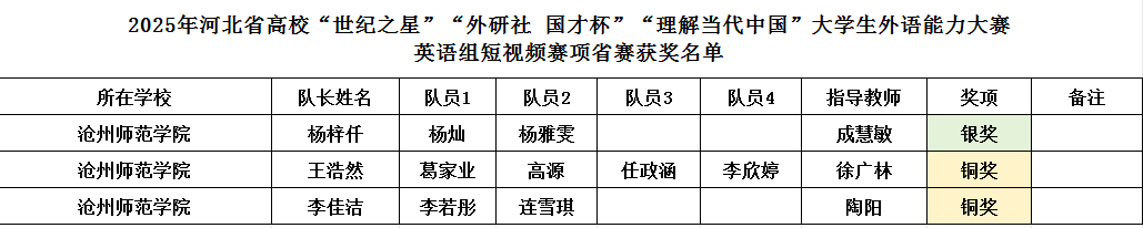 近日,2025年河北省高校“世纪之星”“外研社 国才杯”“理解当代中国”大学生外语能力大赛英语组短视频赛项省赛获奖名单正式揭晓,外国语学院学子表现突出,成功斩获1项银奖、2项铜奖,展现了扎实的外语综合素养与跨文化传播实践能力。