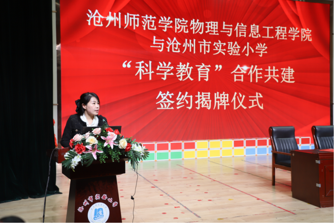 仪式伊始,黄晓寸与杨丽萍分别致辞。黄晓寸指出,双方将在实践教学上,安排学生实习、教师交流;在师资培训方面,共同制定方案提升教师水平;在科学研学中,联合开展活动拓宽学生视野。期望培育出兼具科学素养、创新精神与实践能力的高素质人才。杨丽萍提到,沧州市实验小学高度重视科学教育,希望在课程开发上与物理与信息工程学院合作,打造趣味实用课程;在师资交流上建立常态化机制;在课题研究上借助学院科研力量。期待学生保持好奇心,成长为有科学精神与社会责任感的新时代少年。