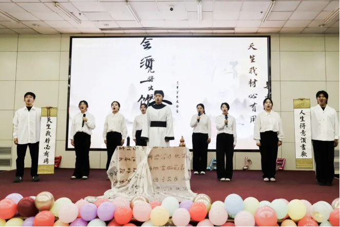 中兴书法社将经典传诵和书法创作相融合,创新演绎李白千古名篇《将进酒》。一边是声情并茂的诗文朗诵,激昂文字诠释诗仙的洒脱胸襟;一边是行云流水的现场书法创作,笔锋流转间定格诗中名句的隽永意境,为观众呈现出一场诗与墨的双重盛宴。