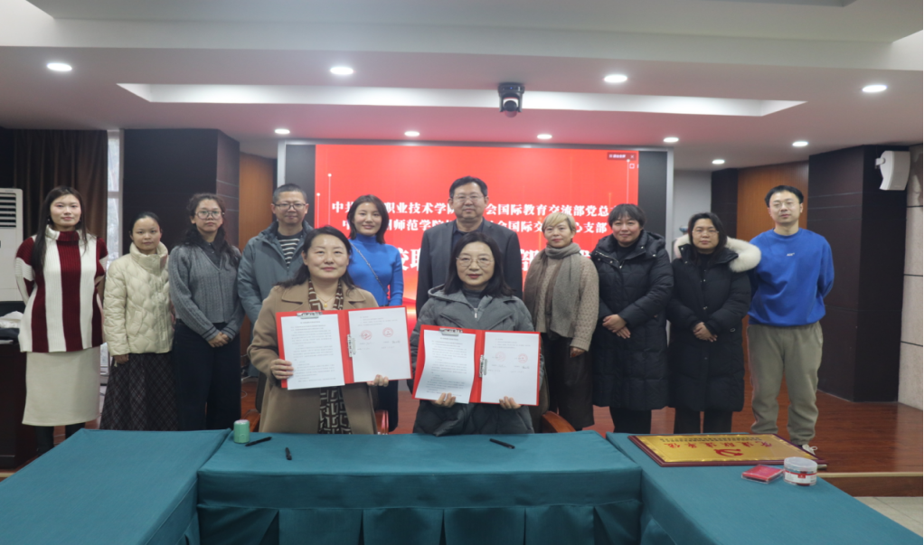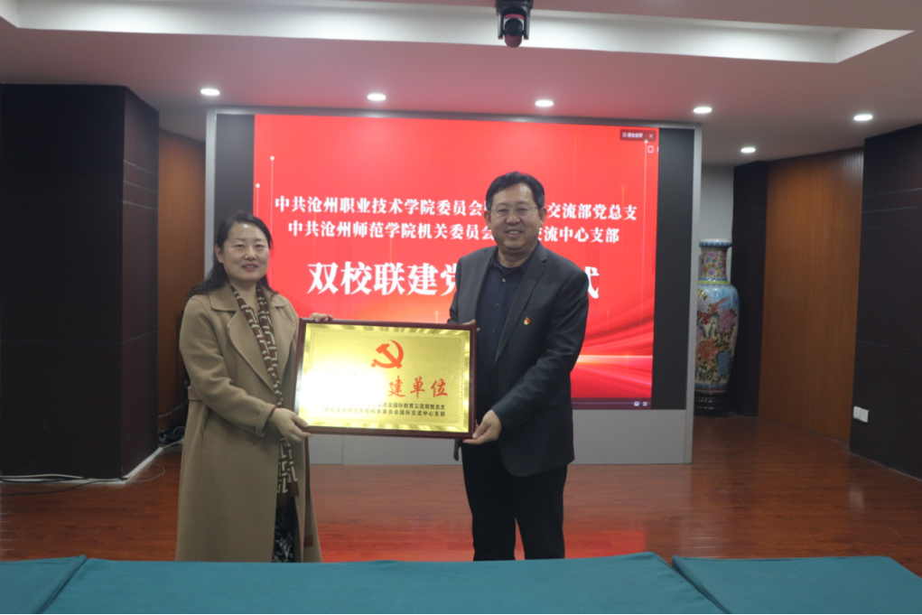会议核心环节,双方签署《校-校联建党支部合作协议》,协议以“资源共享、优势互补、合作共赢、共同发展”为原则,明确了党建共建、组织共促、业务共推、活动共办四大内容及配套合作机制。签约后,沧州职业技术学院人事组织部部长孙向华向韩丽梅院长授予联建牌匾,标志着两校国际交流领域支部联建正式启动。