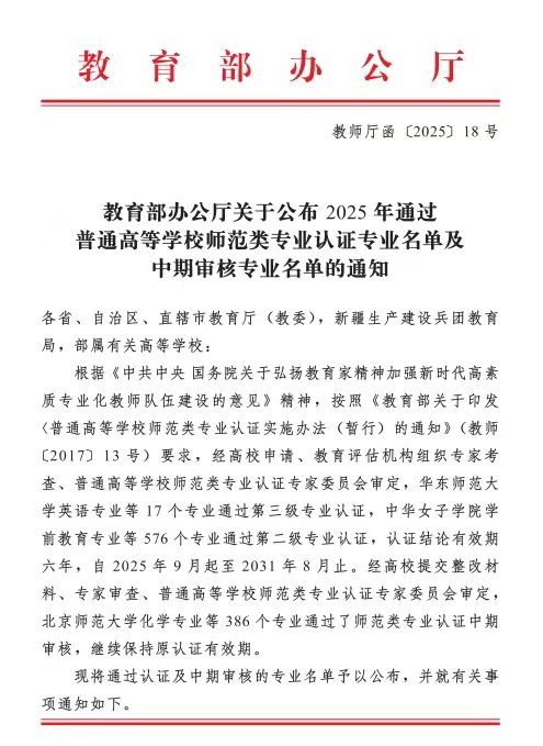 近日,教育部办公厅印发《关于公布2025年通过普通高等学校师范类专业认证专业名单及中期审核专业名单的通知》,公布了2025年通过师范类专业认证的专业名单。我校历史学、音乐学、体育教育、生物科学、小学教育5个专业顺利通过师范类专业第二级认证,认证结论有效期为6年。