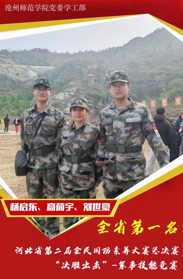 来自全省各地的70支代表队展开为期三天的激烈比拼,竞赛分为单兵综合技能竞赛和军事定向越野竞赛两个环节,涵盖百米障碍、手榴弹投掷、步手枪对不同距离目标快速射击、战场支援行动、无人机操作、军事定向越野。我校选派学生处孙文达老师担任领队,由退役大学生先锋社团杨启东、刘世豪、高荷宇组成的参赛队代表沧州市参赛,经过3天激烈角逐,我校荣获大学组第一名!