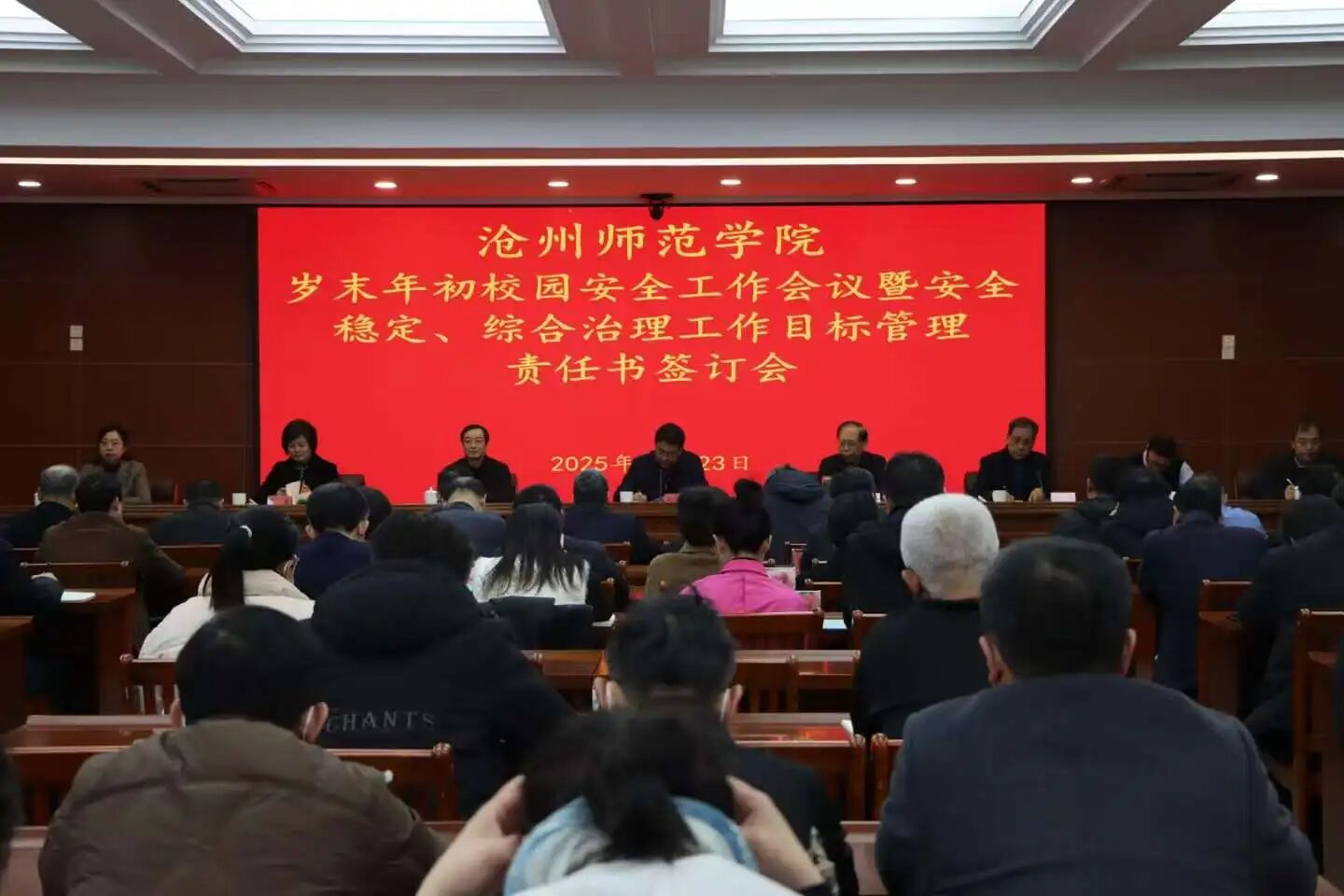 12月23日,我校在齐越四楼会议室召开岁末年初校园安全工作会议暨安全稳定、综合治理工作目标管理责任书签订会。校领导云电军、张占平、邢树军、范小振、高颖、周振平、郭玉秀、朱蓬华出席会议。