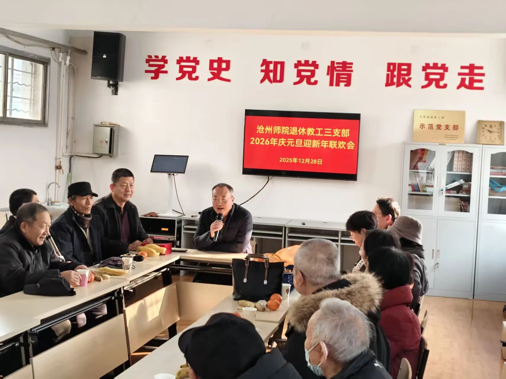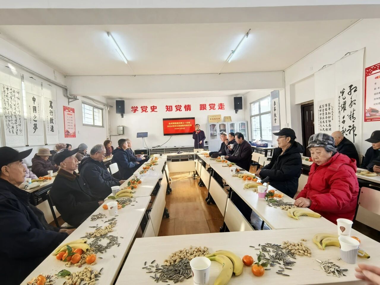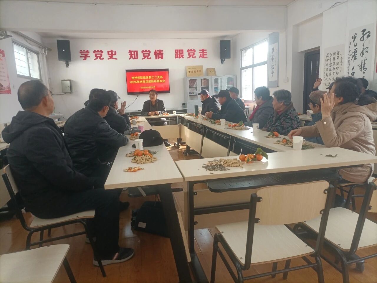 12月26—30日,校组织部老干办会议室欢歌笑语,喜气洋洋。我校退休教工3个党支部先后在此召开2026年庆元旦迎新年联欢会。一支部书记陈桂清、二支部书记王锡智、三支部书记翟玉昌热情致辞,总结布置工作。3场联欢会得到校老干办全力协助支持。