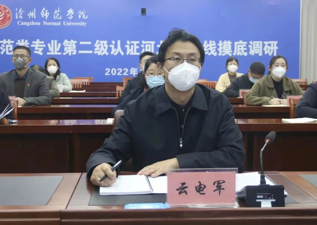 杨金国在致辞中介绍了本次摸底调研工作的基本要求和重要意义。他表示,沧州师范学院始终胸怀木铎素履之志,秉承学高为师,身正为范之风,在困难中奋进,在奋进中崛起,一代又一代师院人思索践行“明德、博学、知行、日新”的校训和“孜孜以求、团结奉献、精益求精、敢于胜利”的师院精神,为河北乃至京津冀地区基础教育和经济社会发展培养了大批优秀人才。近年来,沧州师范学院以师范认证为抓手,大力推进教师教育改革,重塑教师教育体系。希望通过此次机会,共同探讨交流师范专业的评建工作,共同致力于河北省师范专业建设,为培养和造就党和人民满意的高素质专业化中小学幼儿园教师做出更大贡献,也希望沧州师院在师范专业建设的各个方面再创佳绩。