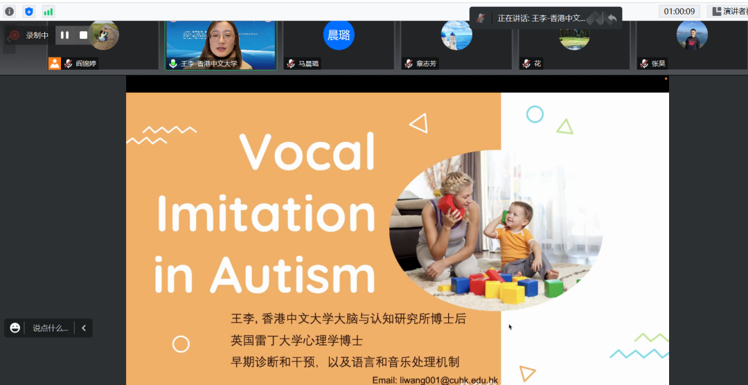 山东大学副研究员张昊、复旦大学副研究员徐坤宇、香港中文大学博士后王李、北京语言大学主管康复治疗师章志芳、湖南大学博士后郭承禹、中日友好医院主管语言治疗师葛丽君、华东师范大学物理治疗师瞿璐、日本筑波大学博士黄金峰、沧州师范学院副教授阎锦婷共9位青年讲者,从不同的方面和各自专业的角度,分析了语言障碍儿童的言语行为,探索了异常语言现象的病理机制。