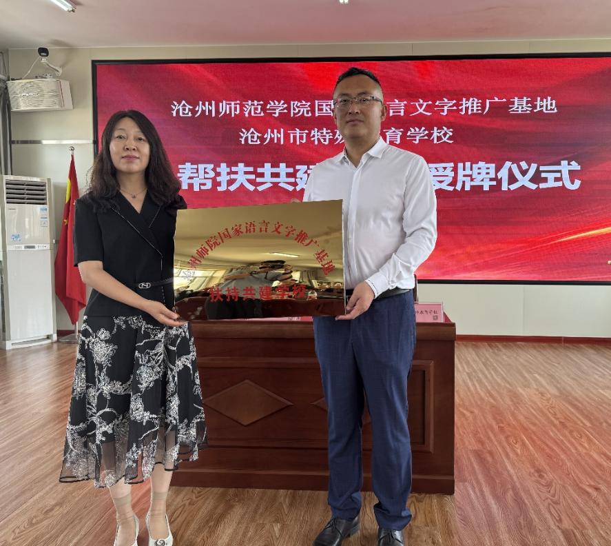 沧州师范学院国家语言文字推广基地与沧州市特教学校签订了帮扶共建协议,沧州市教育局语委办副主任高健将“沧州师院国家语言文字推广基地扶持共建学校”牌匾授予沧州市特教学校。双方均表示,将以签约授牌仪式为契机,继续发挥自身专业优势,积极推广国家语言文字,为推进残障儿童语言的发展贡献力量。