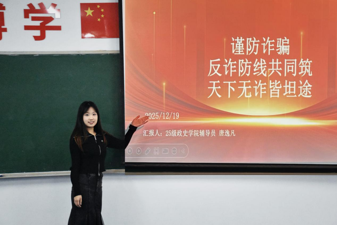 骨干宣讲,纵深推进。在此基础上,政史学院安全委员丁伟业、杜若溪走进各班级开展反诈专题宣讲活动。他们对宣讲内容进行了深化与拓展,通过视频解析、话术拆解、真实案例剖析等形式,将反诈知识讲深讲透,让同学们对网络诈骗的危害与套路形成更深刻的认知。