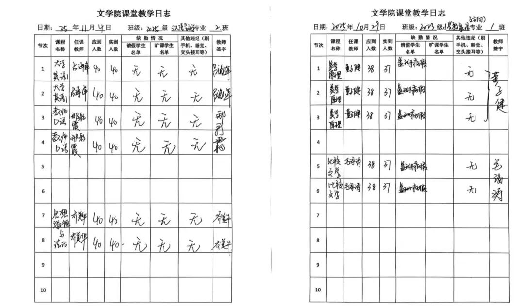 学管队伍持续开展“课堂秩序双线巡查”工作,实施“课堂教学日志”填报制度,每日对课堂出勤、纪律管理、听课状态等关键环节进行检查与记录,及时发现问题、督导改进,全力做好教学质量保障,筑牢学风建设根基。