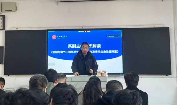 李杰解读了《机械与电气工程系学生校外实习突发事件应急处置预案》,对与会人员进行了系统的安全培训。