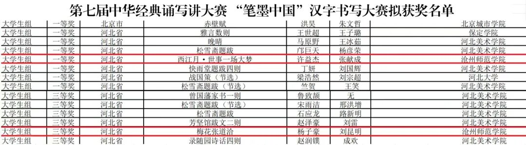 沧州师范学院文学院书法学专业许益杰、杨子豪作品在大赛中斩获佳绩:许益杰《西江月·世事一场大梦》(指导教师:张献成)获毛笔类大学生组一等奖,杨子豪《梅花张道洽》(指导教师:刘昆明)获三等奖,再次彰显了文学院书法人才培养的扎实成效。