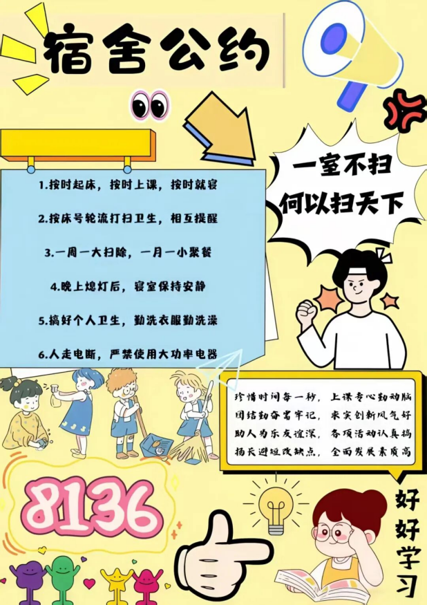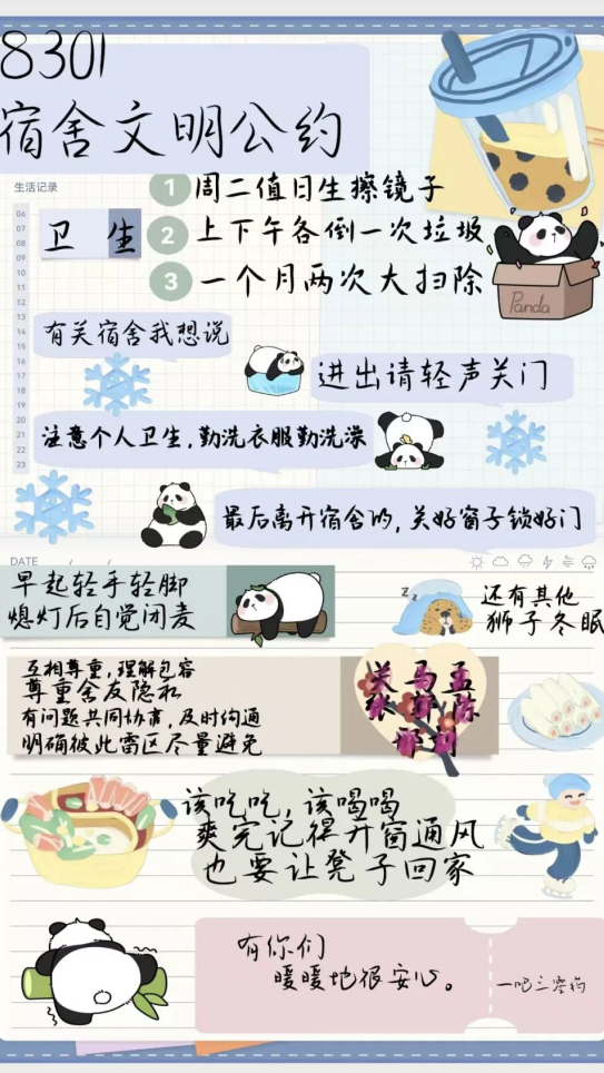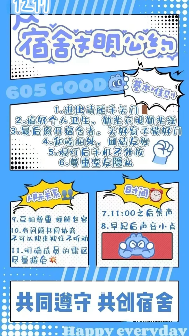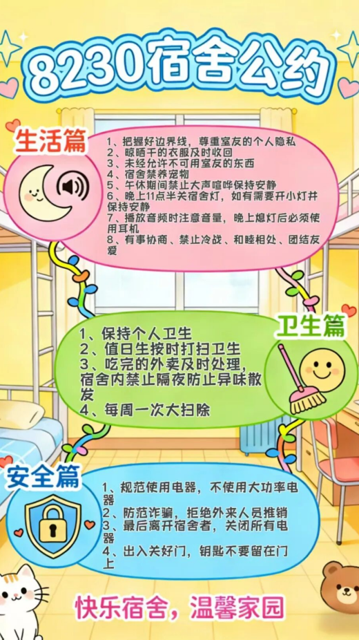 学院自律委生活部组织“宿舍公约共拟·文明准则共践”主题活动,引导各宿舍全员参与公约制定,围绕内务整理、作息时间、人际关系、财产安全等内容达成共识。各宿舍成员在平等协商中细化文明准则条款,切实将文明规范转化为日常行动自觉,共同营造清新整洁、互帮互助、团结向上的宿舍氛围。