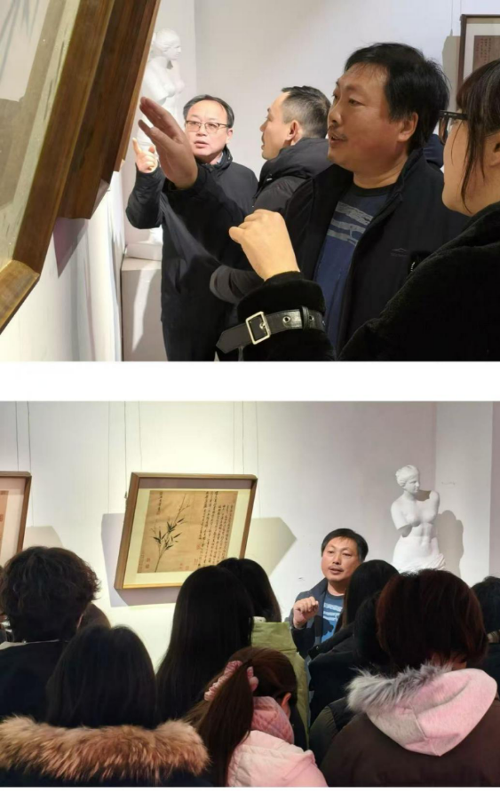 本次教学交流活动也是一场跨学科视角的融合。中文系书法专业教授田雨潇及专业教师于瑞生受邀到访,为现场的师生带来了一场题跋专题讲解。田老师结合展陈的多幅带有题跋的元代墨竹仿真作品,从题跋的形制规范、笔墨意趣与文化内涵三个维度展开细致解读。指出题跋兼具文学性与艺术性,是情感思想载体,引导学生体悟“书画同源”的实践体现,并答疑解惑。