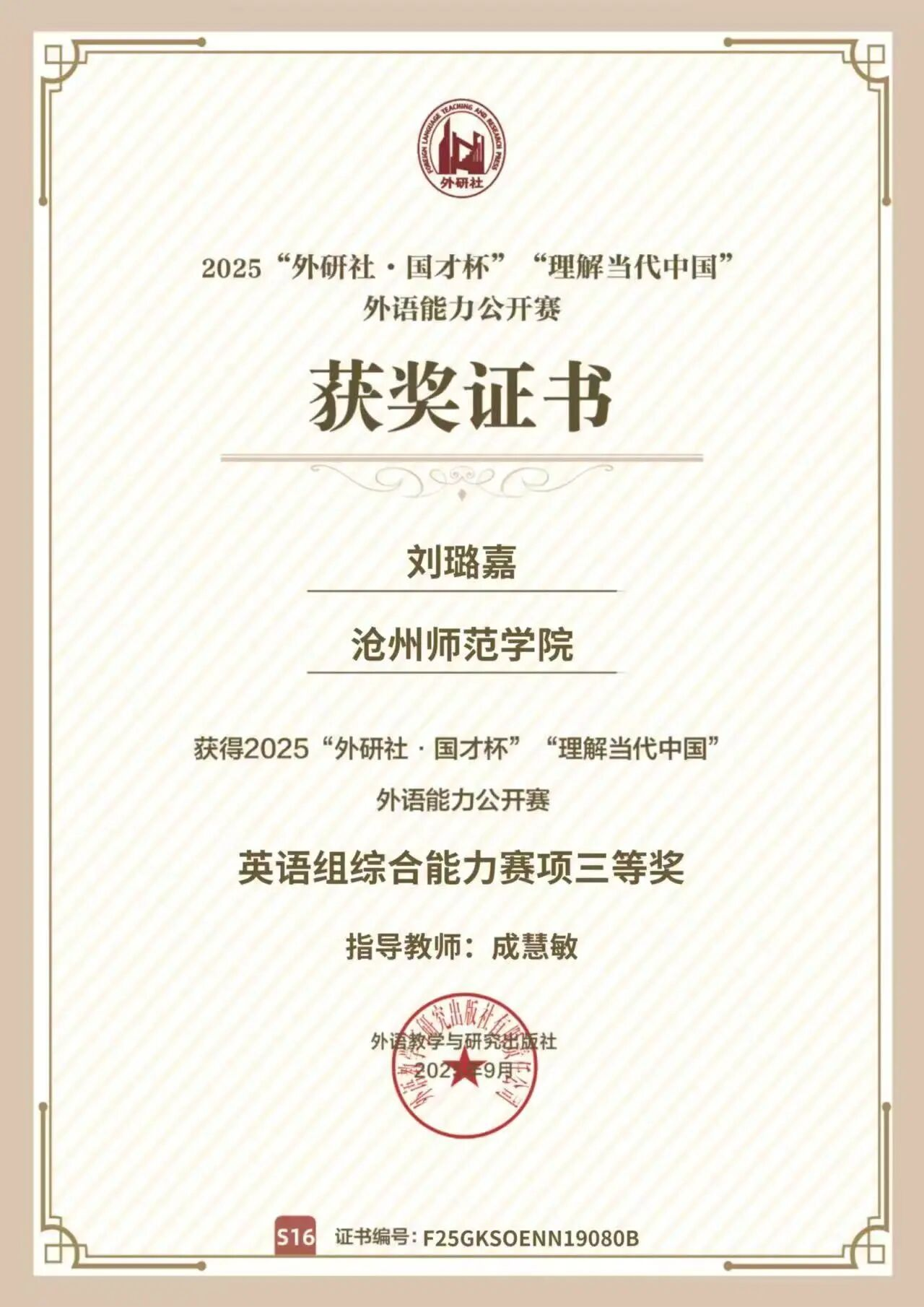 为贯彻落实“以赛促学”的教育理念,提高学生的外语综合应用能力,激发学生学习外语的积极性与主动性,教育学院鼓励学生积极参加各项英语比赛。近日,2025年“外研社·国才杯”“理解当代中国”大学生外语能力大赛国赛落下帷幕,教育学院学生在该项比赛中取得了优异成绩。