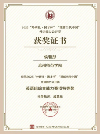 2024级小学教育专业四班的侯若彤同学在英语组综合能力赛项中荣获特等奖。