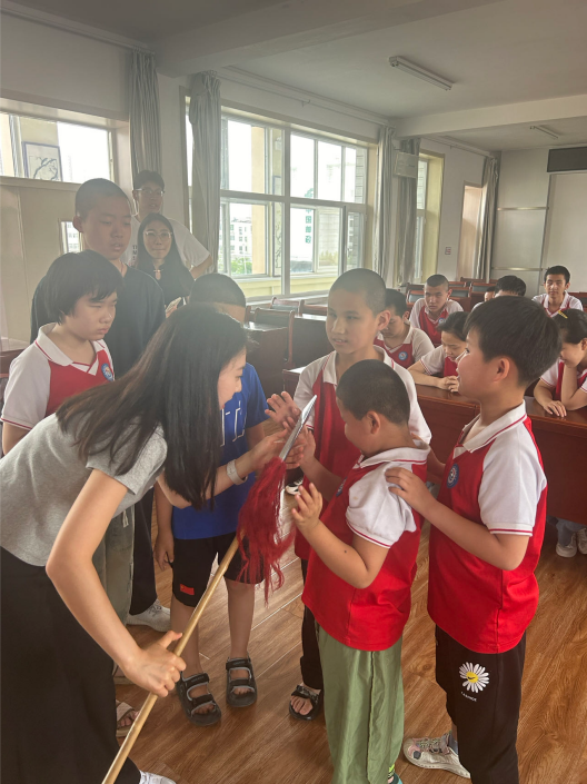 段晨老师运用生动的语言将电影中的场景、人物和情节一一呈现在盲童们的脑海中。盲童们听得津津有味,仿佛身临其境,影片紧张刺激之处孩子们自发小声讨论,有趣生动之处孩子们放声大笑,现场气氛热烈活泼。讲述完毕后,段晨老师向盲童们展示了影片中十分重要的三样道具:粘有鸡毛的信件、红缨枪和小炮。盲童们依次触摸了鸡毛信和红缨枪,并且闻了小炮中的火药,调动他们的嗅觉去感受战争期间硝烟的味道。这些真实的触感和味道让盲童们更加深入地理解了电影中的情节和背景,也让他们对那段历史有了更加深刻的感受。
