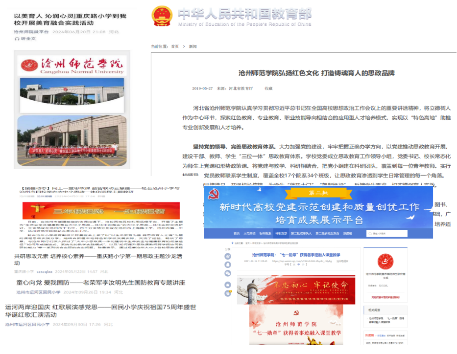 本案例负责人申报的《地方红色文化资源赋能大中小学思政课一体化建设——以沧州市为例》获教育部2025年度高校思想政治工作质量提升综合改革和精品建设项目,实现我市在该项目上首次突破。在此基础上立项省级教改课题2项。学院其他思政课教师多次参加省、市、校各级讲课比赛,3人获教育部微课展示典型案例、省级教学信息化比赛一等奖,2人获省级青教赛二等奖、1人获三等奖,9人获省级青年教师思政课比赛二等奖、1人获三等奖。6节课入选河北省思政课实践教学精品课,1节课入选河北省“习近平新时代中国特色社会主义思想”精品视频课程库。录制红色讲解视频100余个。