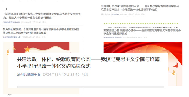 跨学段教研联动平台。以河北省教育系统先进集体沧州师范学院马克思主义学院为主阵地,依托河北省大中小学思政课一体化集体备课中心(沧州市)及马克思主义学院红色文化长廊,组织两场沧州市大中小学思政一体化集体备课会、三场沧州市大中小学“开学第一课”,并累计召开多场思政研讨会,创设教师联合教研机制。