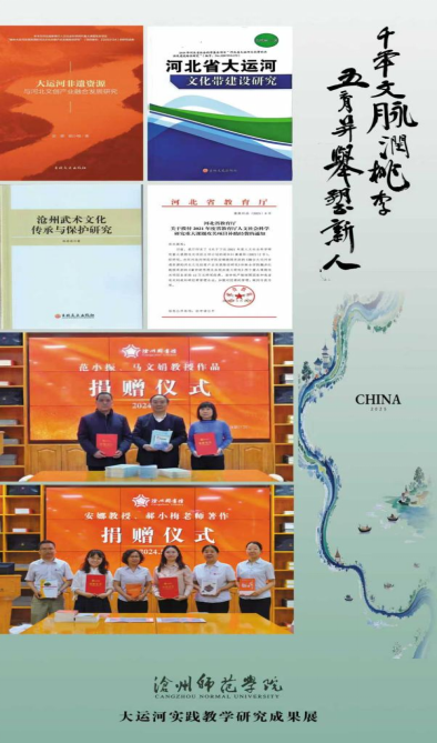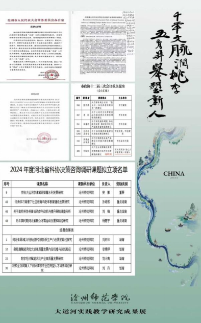 依托学校的河北省大运河文化研究基地,聚焦大运河文化精神阐释、大运河文化保护、资源开发利用等关键领域,立项省、市级科研项目200余项,连续被评为“河北省哲学社会科学优秀研究基地”,成功举办了河北省大运河文化研究基地“武术文化研讨会”;《沧州师范学院学报》设立“大运河文化研究”特色栏目,累计刊发大运河文化精神阐释、非物质文化遗产保护、资源开发与利用等相关主题论文68篇,总下载量达2万余次,形成了较为广泛的学术影响力与社会反响,荣获全国高校社科学术期刊“特色栏目奖”、河北省期刊特色栏目奖;“大运河文化宣讲团”走进沧州市干部培训学院、国学研究会、沧州市图书馆,在政府、社区、学校广泛传播运河文化;7位教师参与沧州电视台《运河印记》栏目,将专项研究成果转化为大众传播内容,相关提案、决策咨询报告被市政协、市人大采纳。