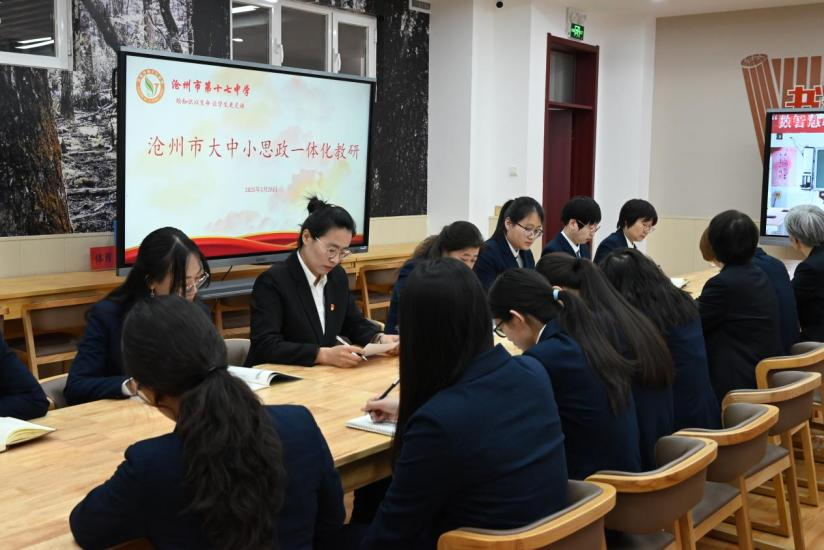“大中小学思政课一体化远程教研”是数智慧疆的价值升华。学校推动数智赋能从技术层、教学层向价值层深化,聚焦立德树人根本任务。2025年4月1日,学校依托“云端共研”平台,成功举办了以“生命安全及健康教育在大中小思政一体化中的落实”为主题的远程联合教研。沧州师范学院、沧州市第十七中学、沧州市上海路小学、第一中学及新疆轮台沧州小学五个会场同步联动。这不仅是一次教研活动,更是通过数字技术推进大中小思政一体化、共同画好思政育人“同心圆”的创新实践。