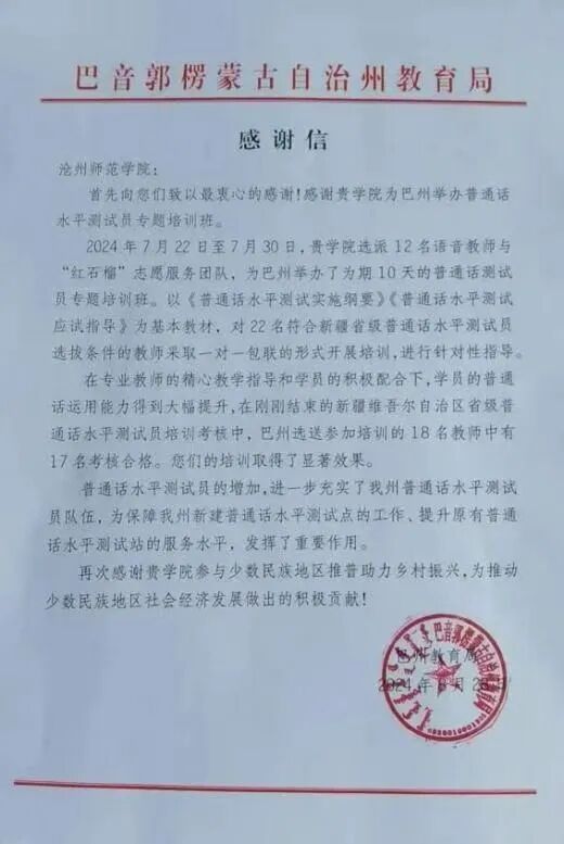 图10 新疆巴州两次发来感谢信,2025年在全疆测试员考核中全部通过三项考试,通过率100%。