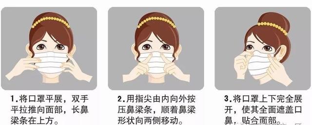 (3)分清楚口罩的正面、反面、上端、下端后,先将手洗干净,确定口罩是否正确之后,将两端的绳子挂在耳朵上。