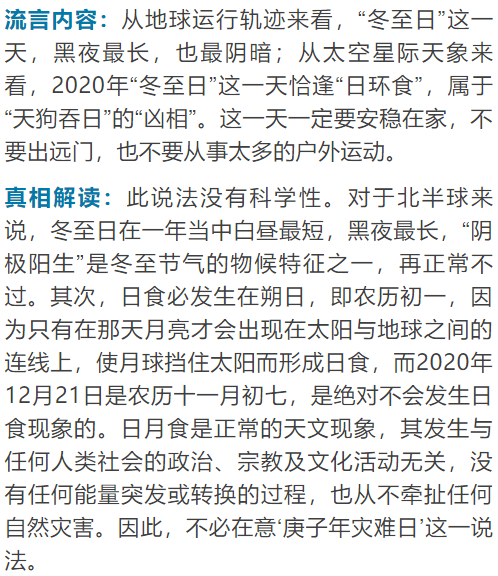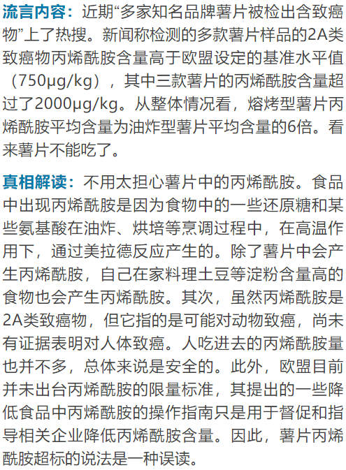 辟谣专栏 当前位置: 首页 >> 辟谣专栏 >> 正文 “科学”流言榜来啦! 发布日期:2021-01-13 1、只要使用加湿器就会导致呼吸道疾病 2、网红牙膏能杀灭幽门螺杆菌 3、2020年冬天将成为60年来最冷寒冬 4、薯片里被检出致癌物超标 薯片不能吃了 5、冬至会发生“日环食” 是“庚子年灾难日” 6、复原乳是“假牛奶”“地沟油”“没营养” 来源:中国互联网联合辟谣平台、科学辟谣平台 上一篇:【长江网】病毒在20度以上室温基本不能存活?同济专家组并没这么说! 下一篇:1月15日全国封城?1月20日后就回不了家了?警惕类似谣言愈演愈烈